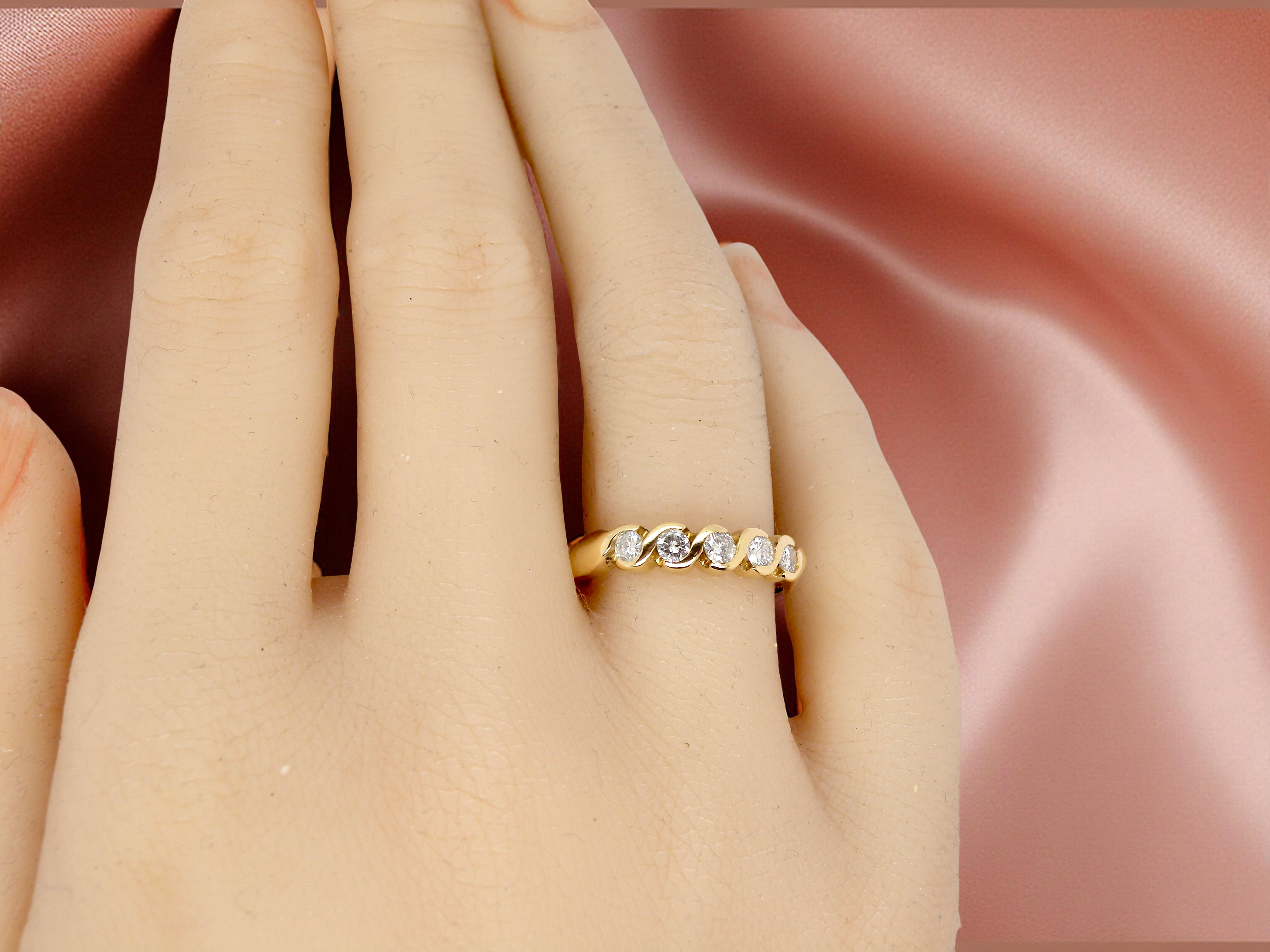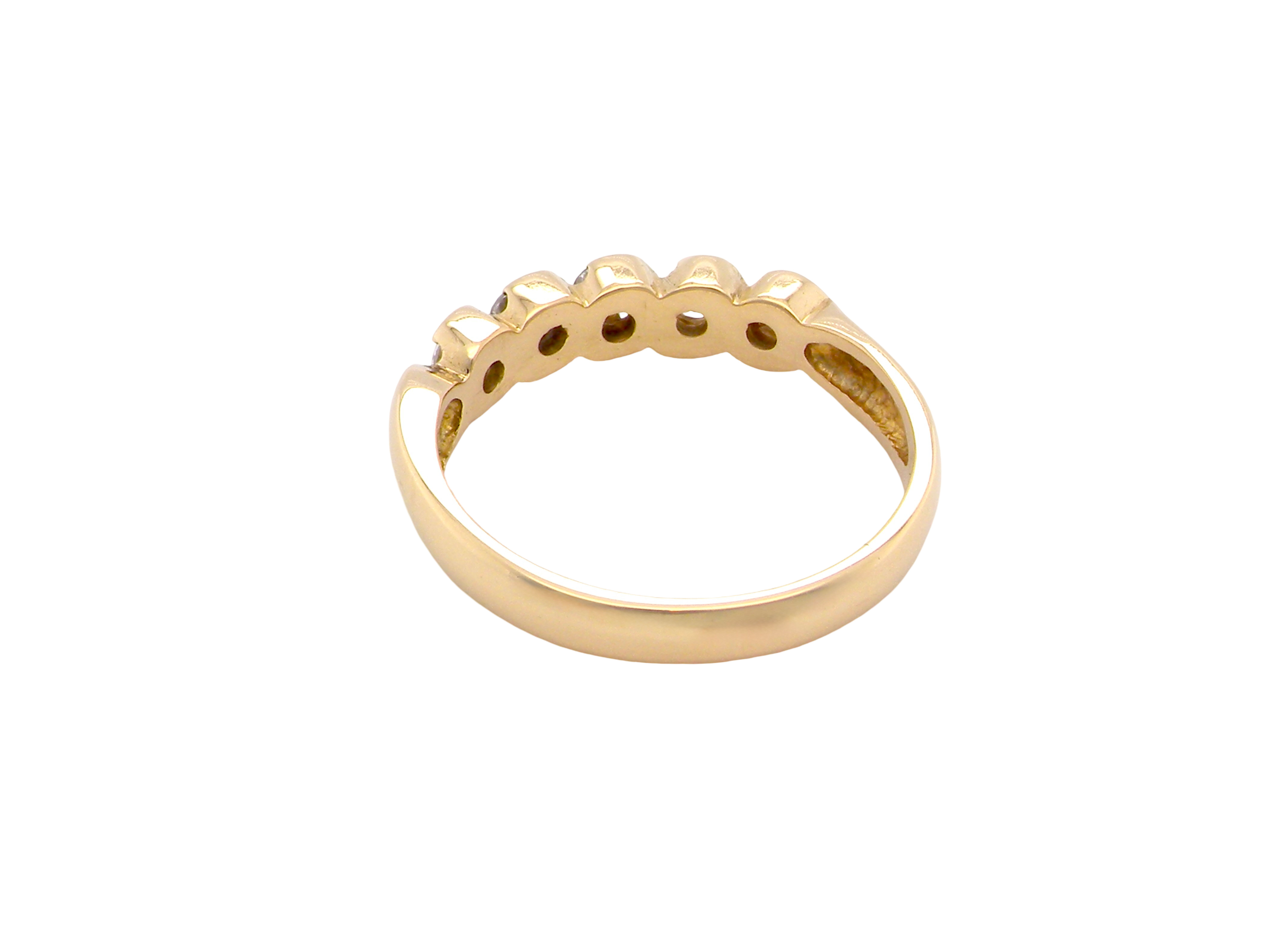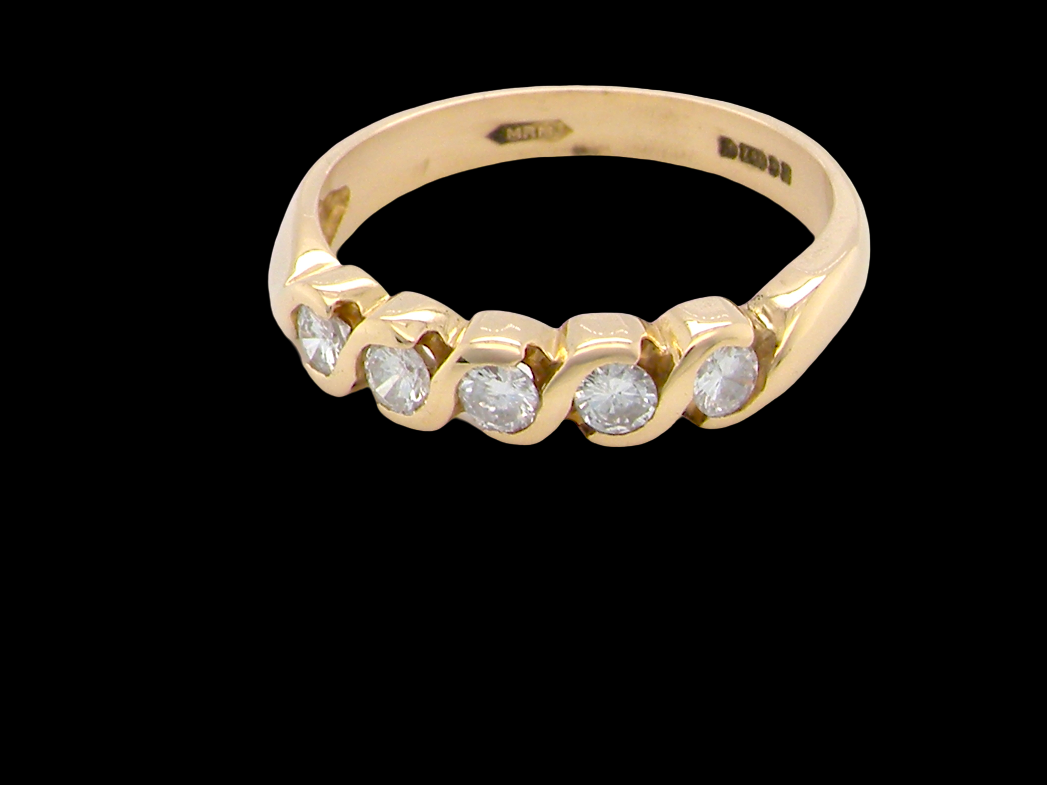 An elegant 18 carat yellow gold half-hoop eternity ring, set with five brilliant-cut white diamonds in an invisible “lazy S” setting. Each diamond measures approximately 3mm, with a total estimated diamond weight of 0.50 carats. Diamonds are colour I–J with SI clarity.