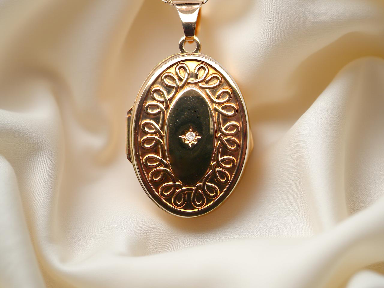 A 9 carat gold locket. Oval shaped, 25x18mm. A tiny diamond is set to the centre.