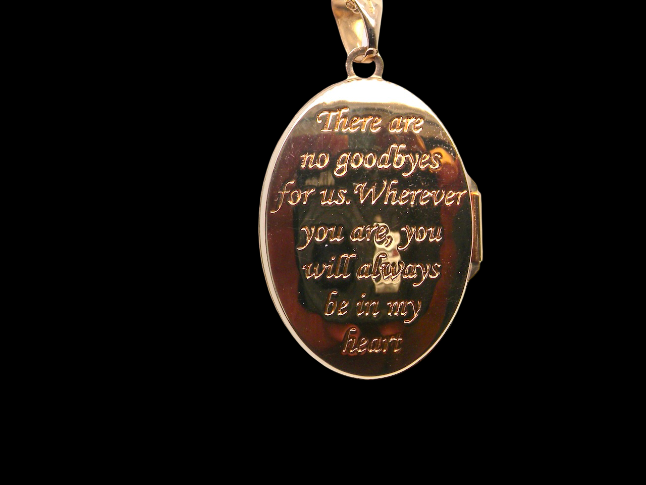 Scrolled engraving work, reverse has a meaningful message. Hinges open to reveal areas to store a photograph.